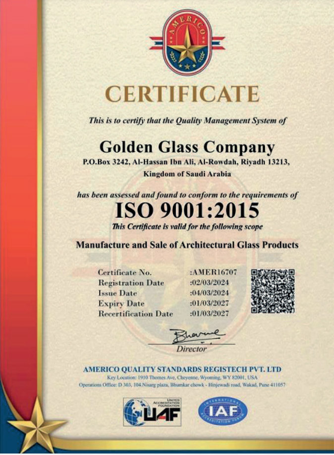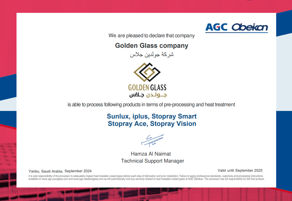Golden Glass Company holds prestigious certifications from ISO, Guardian Glass, and AGC Obeikan, confirming our commitment to quality and industry standards.
